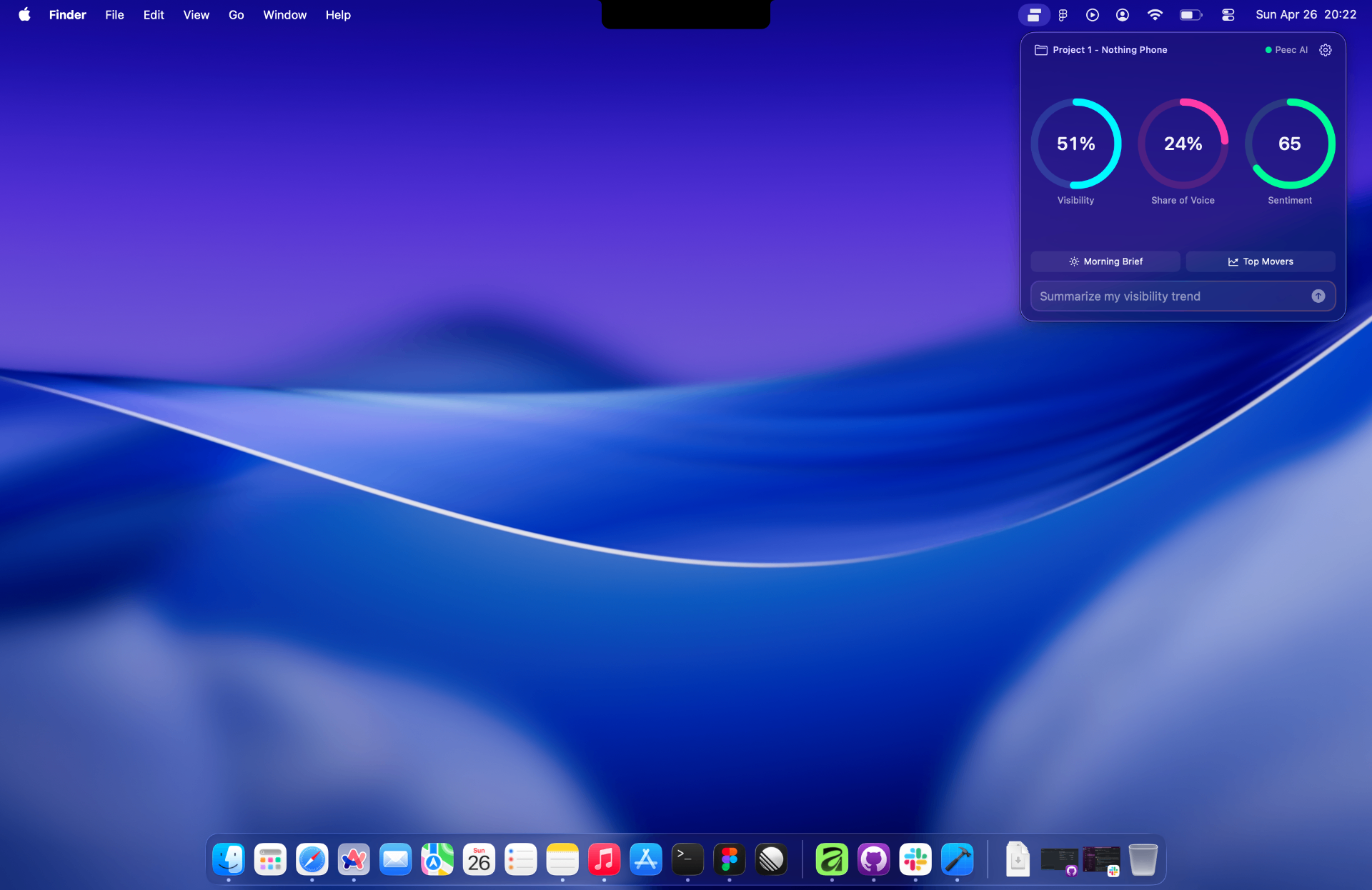 QuicPeek lives in your menu bar and shows where your brand appears across ChatGPT, Perplexity, Claude and more — powered by Apple's on-device Foundation Models. Sign in with Peec.ai to get started.